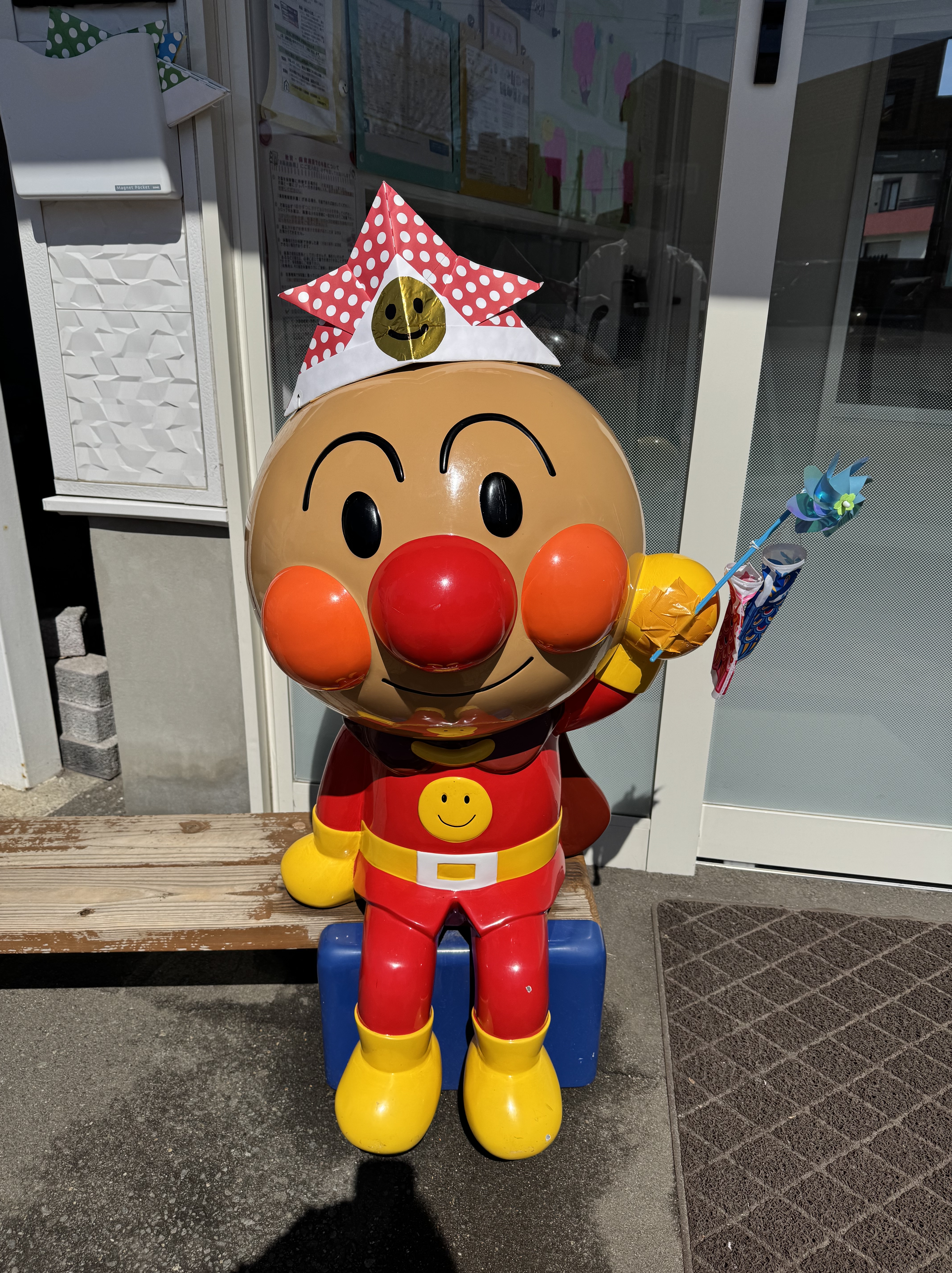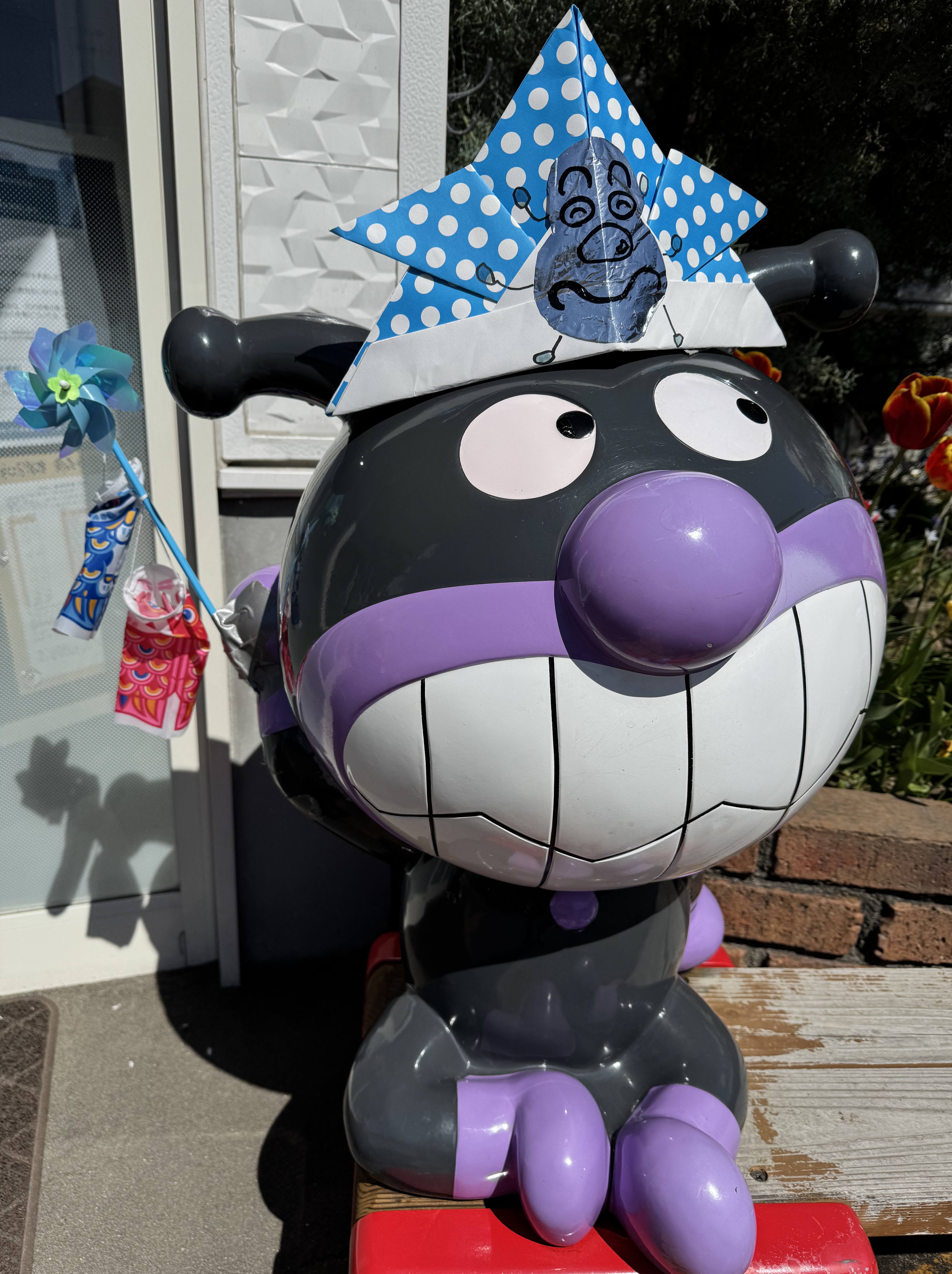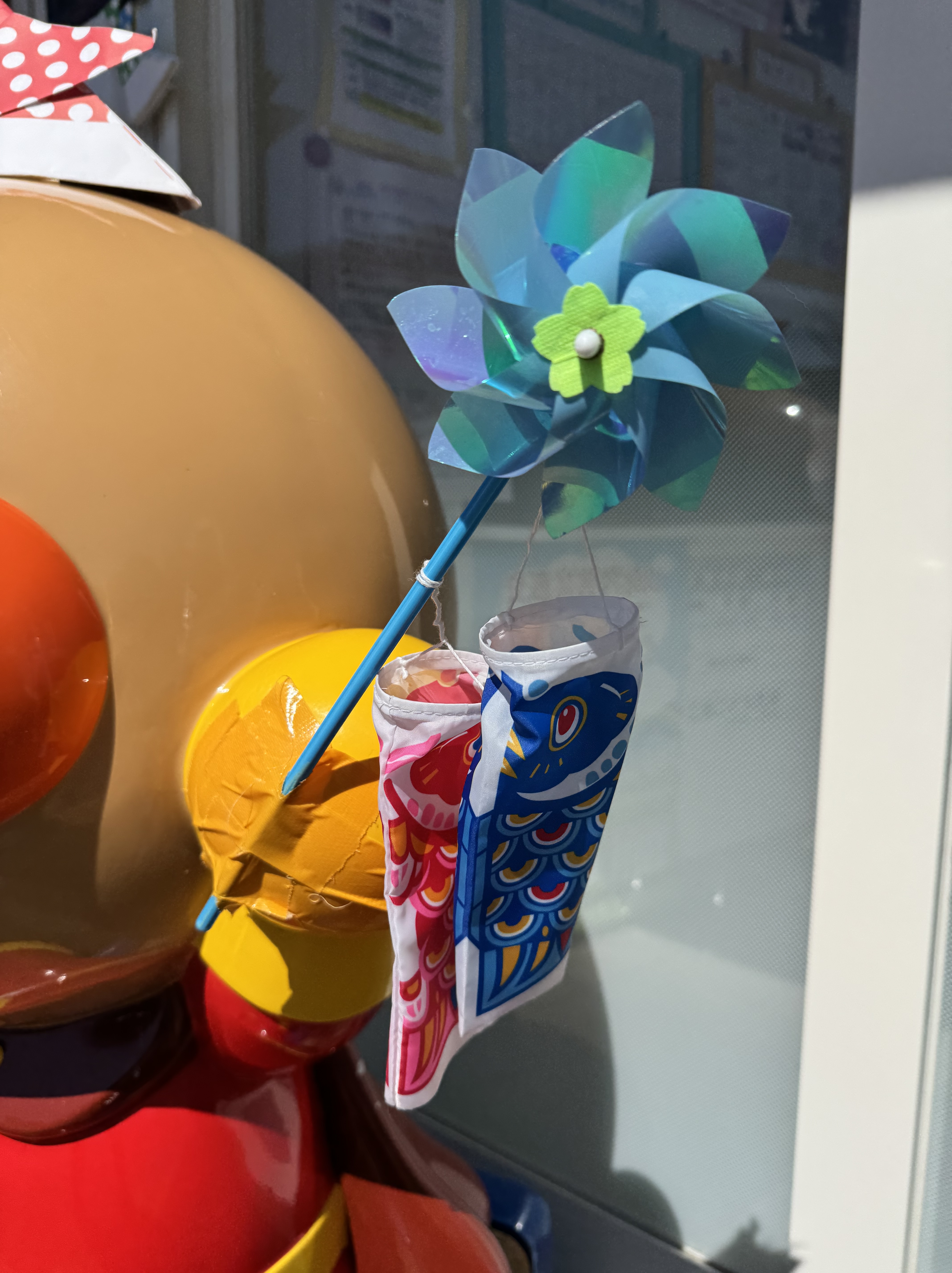 毎年つぼみ保育園玄関前のアンパンマンとバイキンマンは、こどもの日バージョンのフォトスポットがあります。